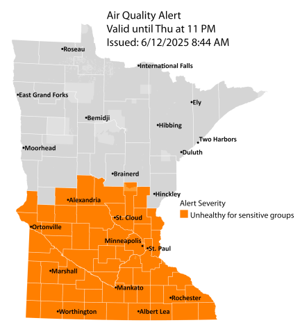 An air quality alert continues for central and southern Minnesota. The alert runs until 11 p.m. on Thursday, June 12. The affected area includes the Twin Cities metro area, Alexandria, Albert Lea, Marshall, Worthington, Rochester, St. Cloud, Winona, Ortonville, Mankato, and the Tribal Nations of Upper Sioux, Prairie Island, and Mille Lacs.